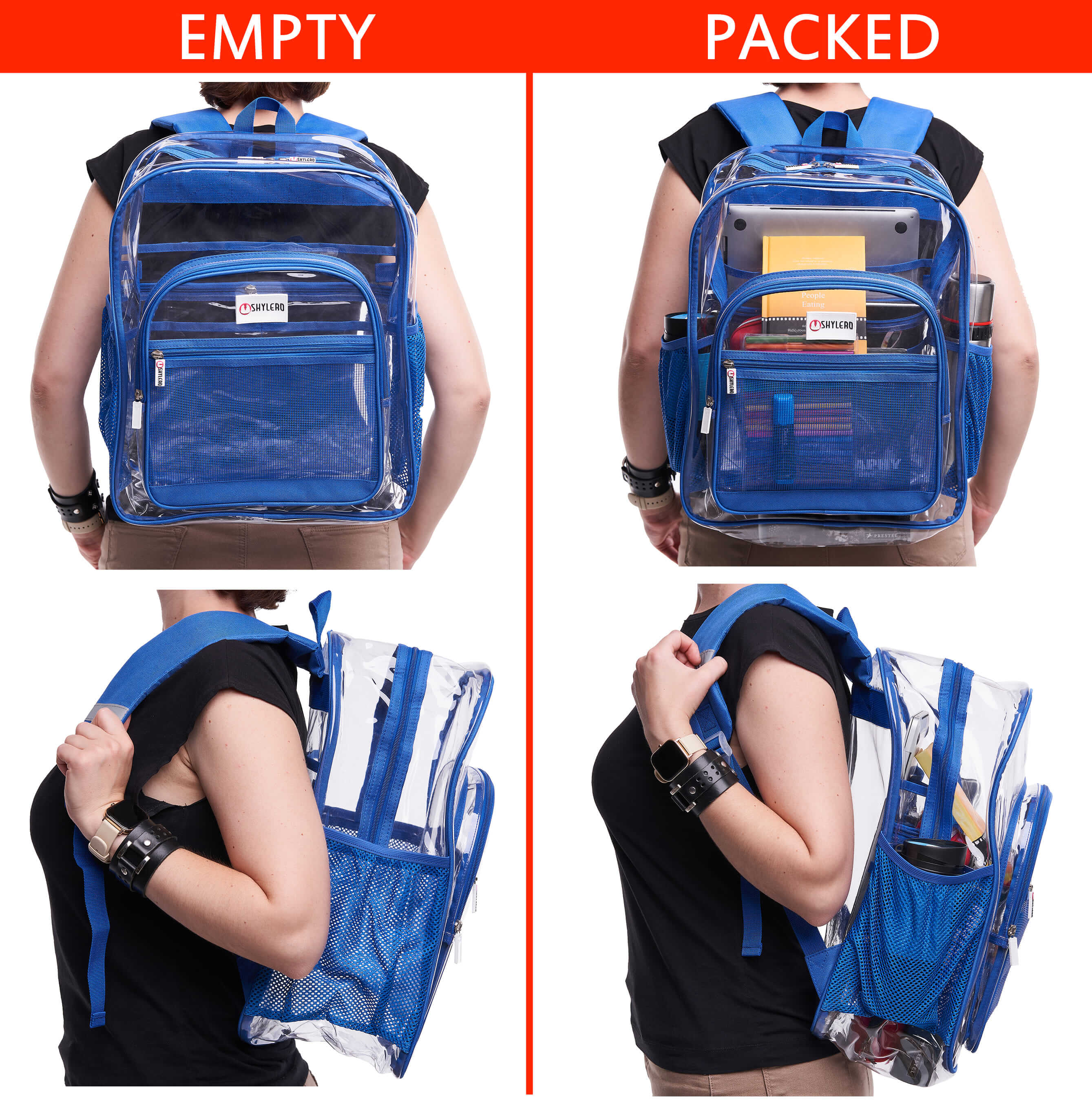 - STYLISH & MULTIPURPOSE heavy-duty clear backpack is perfect for school, university, gym, beach, outings, stadiums, or any other daily routine. This sturdy clear bookbag is unisex and perfect for everybody