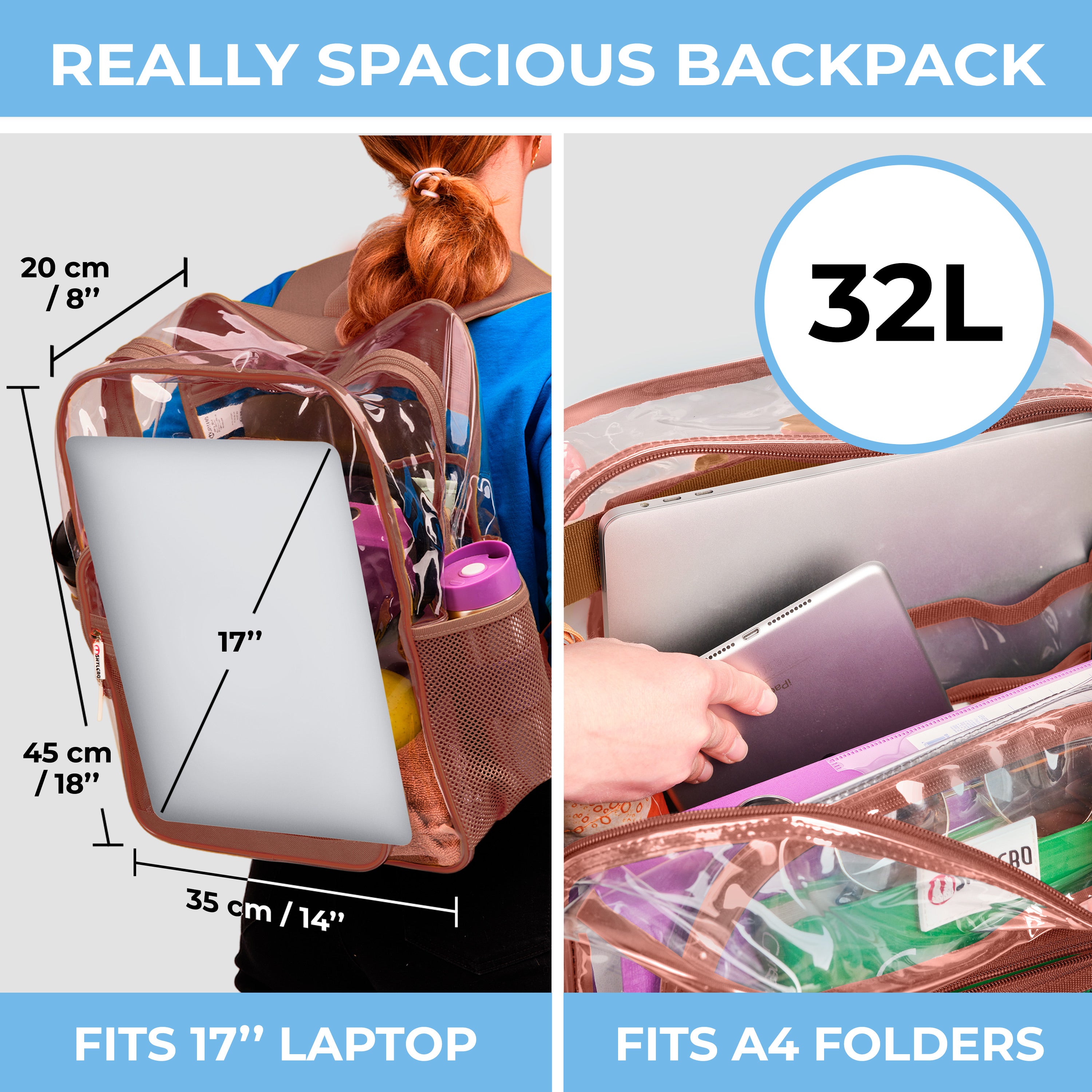 - 32L ROOMY CAPACITY - H18''xW14''xD8 (H45xW35xD20 cm) with expandable big side pockets, three internal pockets, extra large transparent backpack has plenty of space to store your items securely